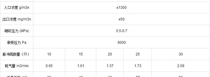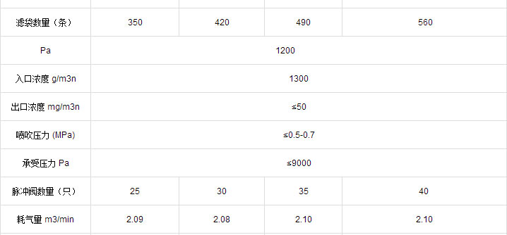 4、鑫辰XMC分室脈沖布袋除塵器濾袋的材質(zhì)一般采用滌綸針刺氈,允許使用溫度可達(dá)120℃,如濾袋采用美塔斯高溫度于上述濾料的允許溫度,廢氣進(jìn)入除塵器之前應(yīng)采用降溫措施。該系列除塵器有60-2、60-3、60-4、60-5、60-6、70-5、70-6、70-7、70-8九種規(guī)格,具體性能參數(shù)表如下: